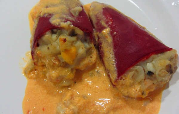 5º) Mientras, vamos rellenando los pimientos de piquillo con el relleno anterior, cuidado de que no nos rompan, para ello no debemos llenarlos demasiado.