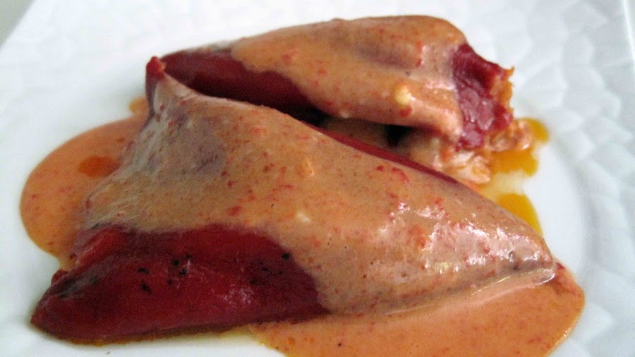 Cuando ya están los pimientos del piquillo, el relleno y salsa, Ponemos en una bolsa el relleno, cortamos un poco la punta y rellenamos los pimientos, los ponemos en una fuente para horno, la salsa por encima y dejamos en el horno unos 15 minutos a 170º.