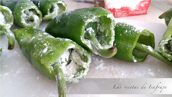 Con ayuda de una cuchara pequeña los vamos rellenando solo hasta la mitad, porque cuando se caliente, el relleno se expandirá por el interior del pimiento. Los tapamos con sus respectivos rabos y echamos un poco de harina para que se quede bien taponado.