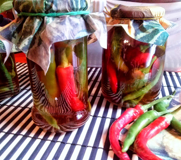 Enjuagamos bien los pimientos y secamos.Pon un poco de sal en el bote, mete los pimientos en él y rellena de vinagre. Cierra bien el bote y guarda en un lugar seco y retirado de la luz.