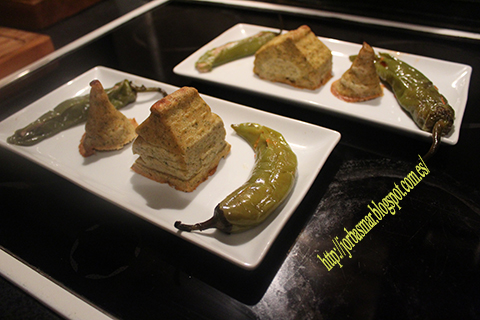 El contenido del plato no es otra cosa que unas casitas de coliflor, con unos pimientos fritos sobrantes, rellenos de foie gras y sobrasada.