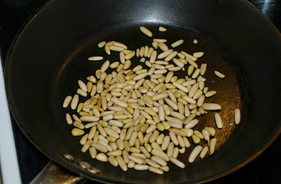 - Tostamos los piñones ligeramente en una sartén muy caliente.