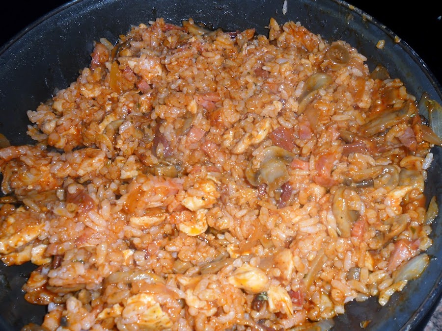 En una sartén con un chorrito de aceite,sofreir los ajos, perejil, champiñones laminados muy limpios y tomate, una vez frito incorporar el arroz y escurrir el sobrante de aceite.