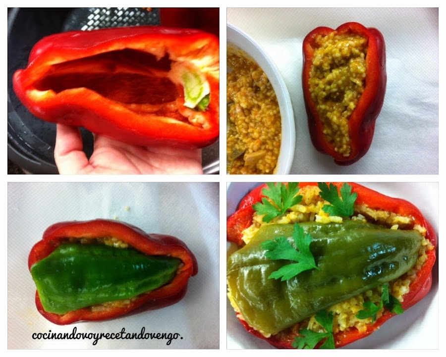 Aquí os dejo un paso a paso corto, para que veáis como queda unos pimientos cortados de forma vertical y usamos de tapadera un pimiento verde. Contrasta muy bien en color y las porciones de arroz son más pequeñas ya que con cada pimiento tendríamos dos raciones.