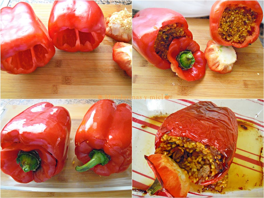 Quita todas las pepitas de dentro de los pimientos y rellénalos con la mezcla de carne y arroz, no los llenes hasta arriba, deja como un dedo sin rellenar para poner la tapa.