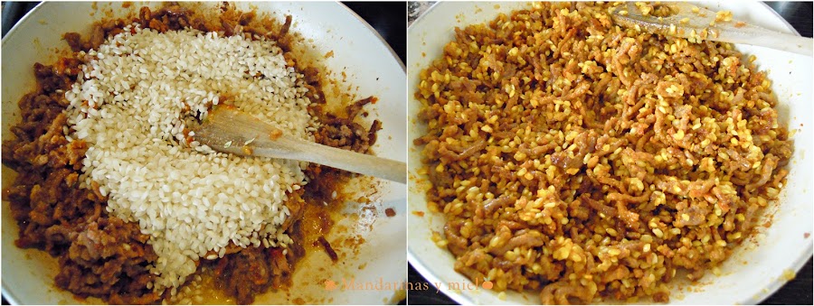 Añade el arroz a la carne, sazona y rehoga todo junto unos minutos, apaga el fuego y reserva.