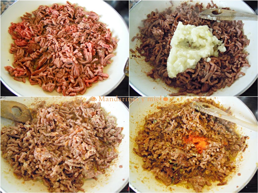 Pon una sartén al fuego con aceite, cuando esté caliente añade la carne picada y rehoga hasta que cambie de color, salpimenta al gusto.