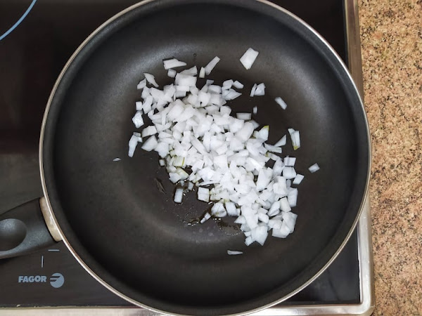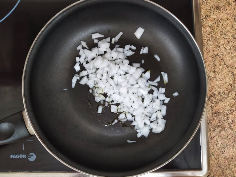 En una sartén con un chorrito de aceite de oliva pochamos la cebolla con un poco de sal (ayuda a que poche más rápido) previamente pelada y cortada en trozos pequeños.