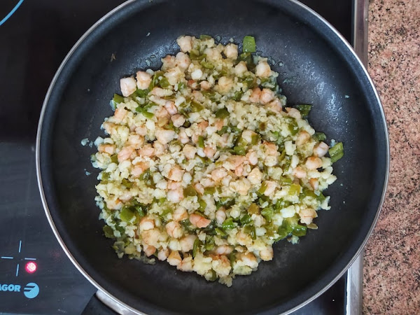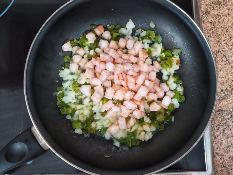 Cuando estén las verduras pochadas añadimos el bacalao previamente cortado en dados pequeños o desmigajandolo. No añadimos sal porque aunque este desalado es un producto de mar y siempre aporta algo de sal. Cuando el bacalao este casi hecho añadimos los langostinos. Dejamos que se haga todo bien y cuando este listo reservamos.