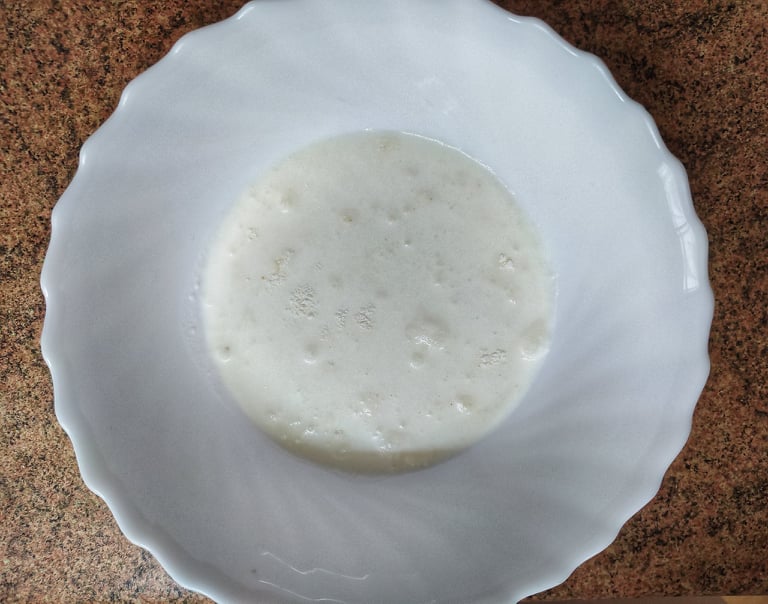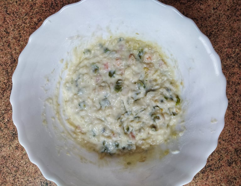 Nos ponemos con la elaboración de la bechamel en frío. En un bol mezclamos 100 gr de bechamel con 335 ml de leche, removemos con una varilla hasta conseguir la textura deseada sin grumos, podéis añadir un poco más de leche si queréis que quede un poco más líquida.