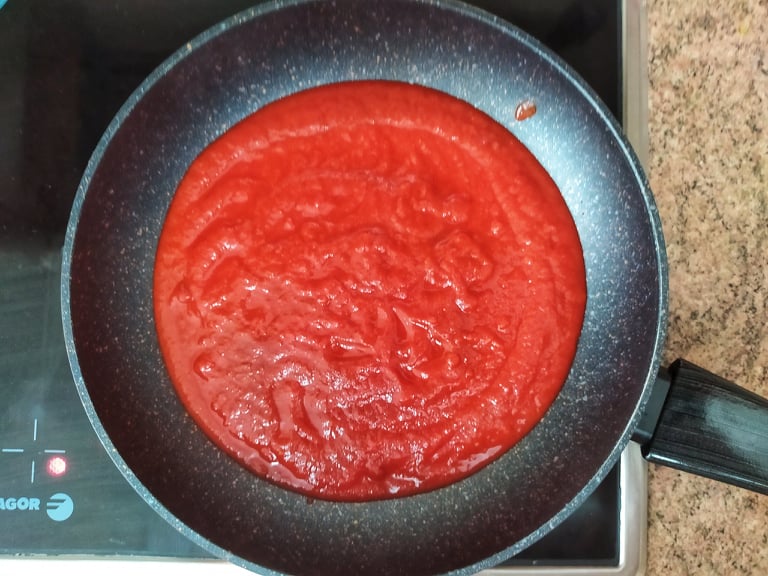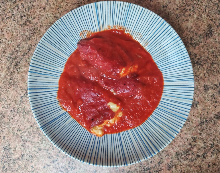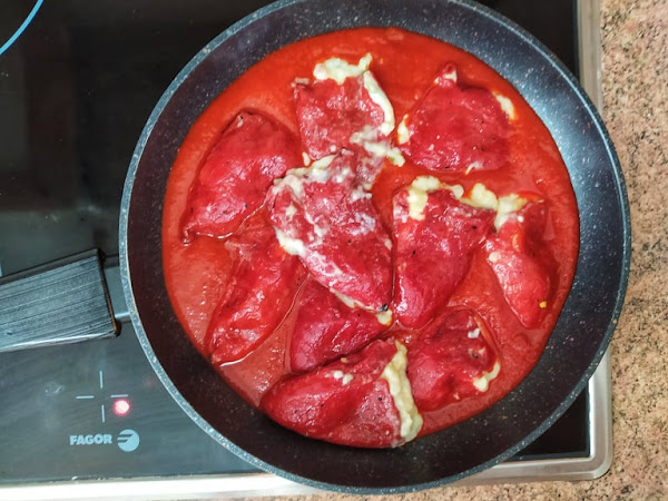 En una sartén ponemos la salsa de piquillo a calentar. Bajamos a fuego medio y añadimos los pimientos rellenos, y dejamos cocinar unos 10 minutos sin remover para que no se rompan. Una vez listos, emplatamos y ¡a comer!