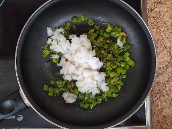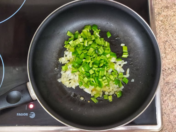 Lavamos, sacamos y cortamos el pimiento verde. Lo añadimos a la sartén.