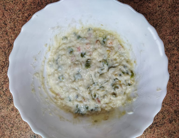 Añadimos a la bechamel el relleno de bacalao y langostinos, removemos. Rellenamos los pimientos con la mezcla.