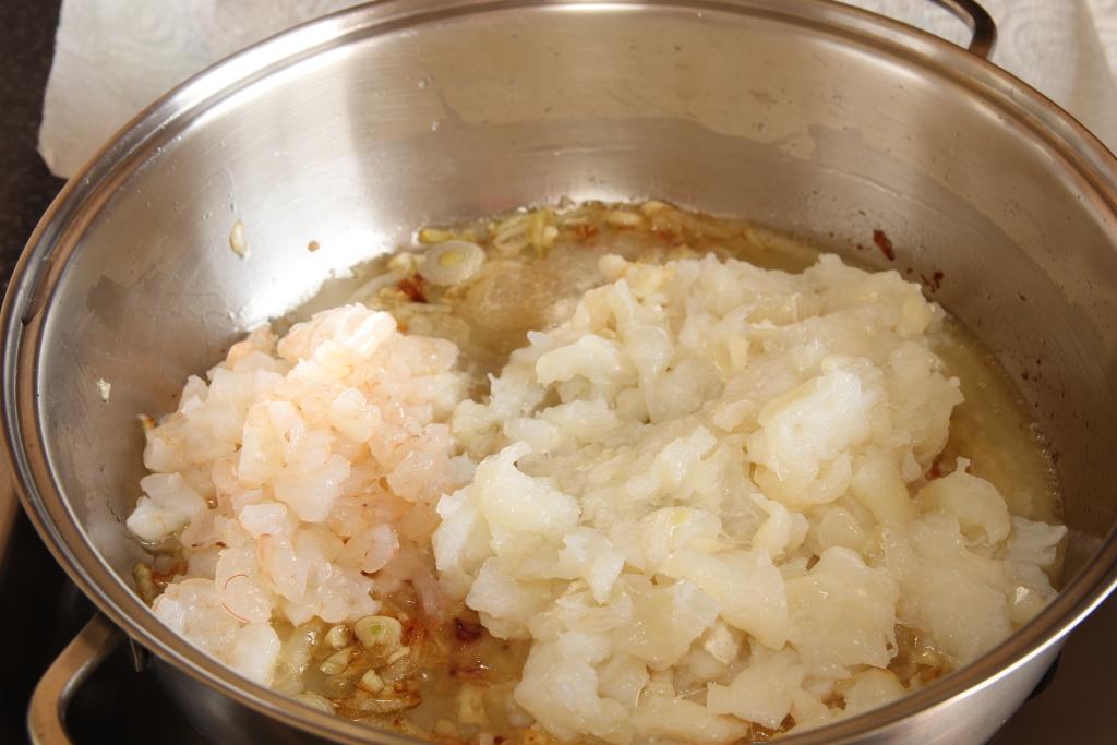 Desmigamos menudo el bacalao y reservamos. Troceamos menudas las gambas y reservamos.