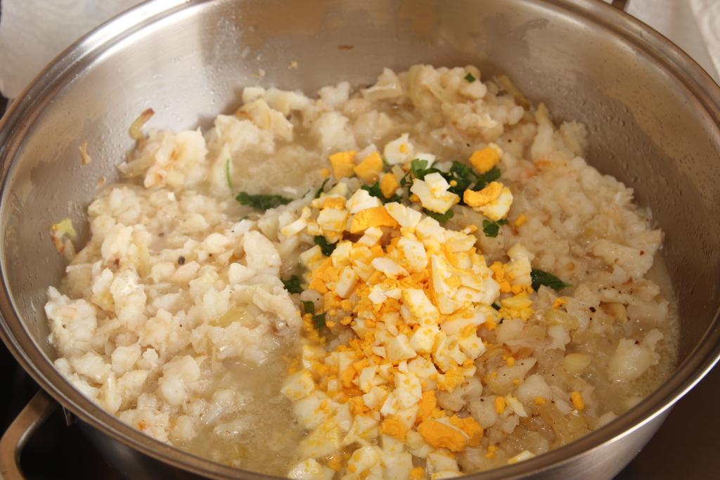 Pelamos la cebolla, la picamos finamente y echamos en una cazuela con chorrito de aceite de oliva, pochamos que se dore bien. Añadimos el ajo pelado y picado menudo, removemos un minuto. Incorporamos el bacalao y las gambas picaditas, salpimentamos (ojo que el bacalao lleva su propia sal), echamos el perejil y el huevo picados. Mezclamos bien.