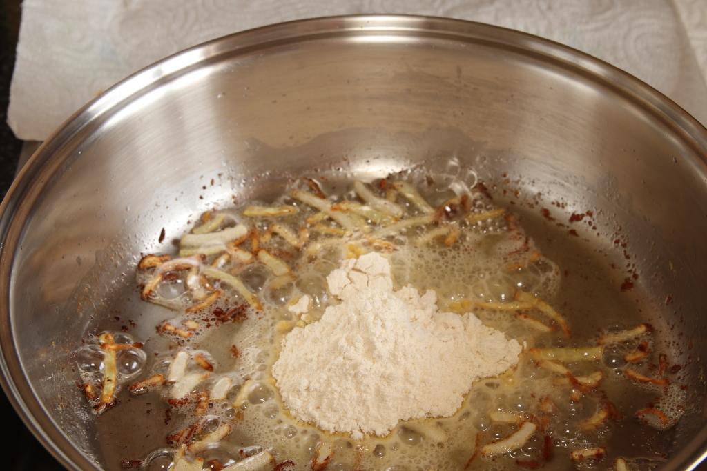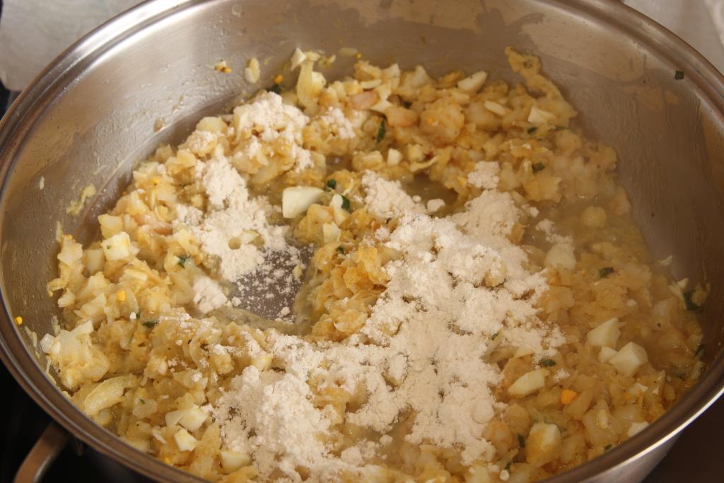 En una cazuela amplia y baja vertemos un chorro de aceite de oliva y doramos la cebolleta, añadimos la harina, mezclamos bien que se cueza.