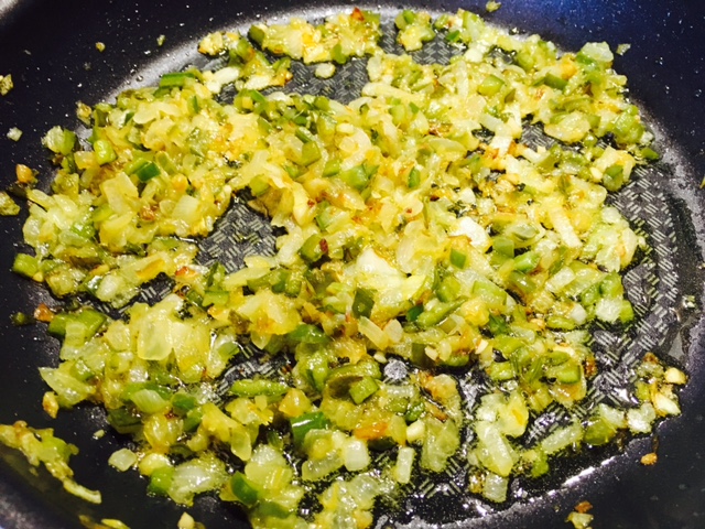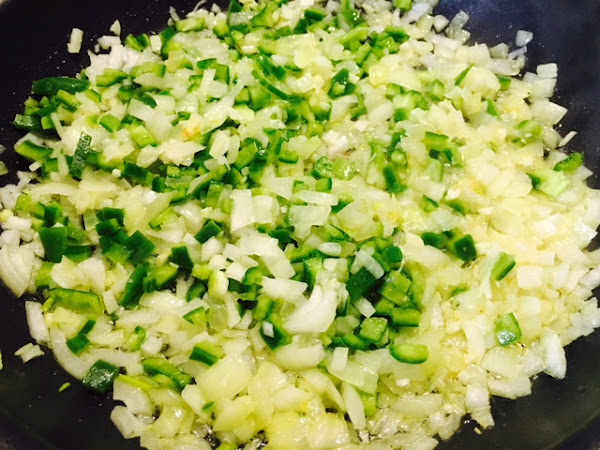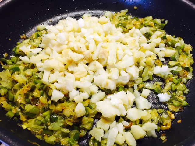 En una sartén amplia o cazuela, ponemos 2 o 3 cucharadas de aceite de oliva y ponemos a pochar la cebolla, el pimiento verde, los dos dientes de ajo y una pizca de sal. Todo cortado en brunoise (cuadraditos pequeños) y a fuego medio-bajo.
