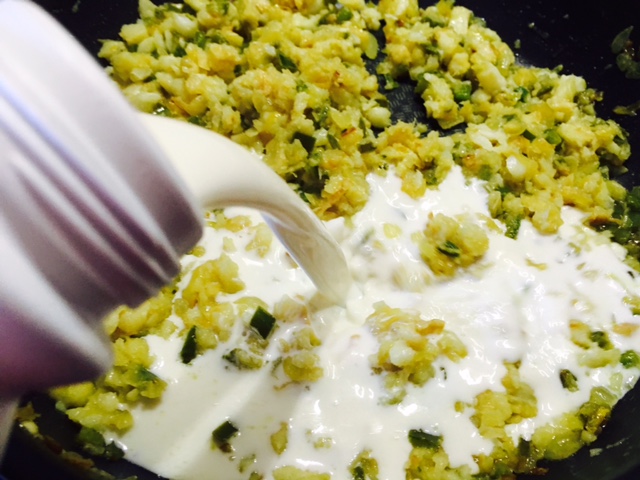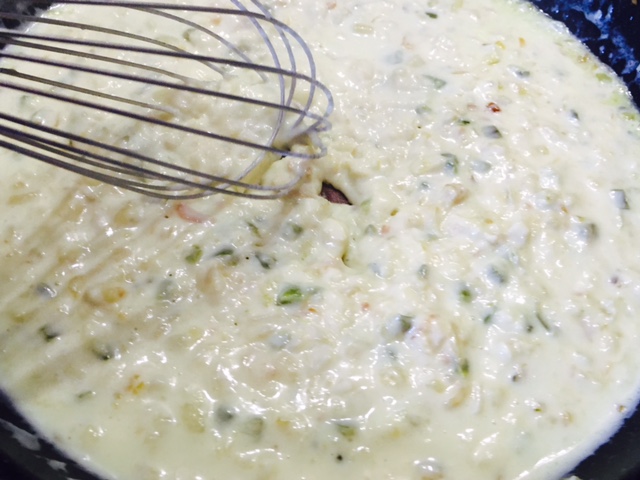 Añadimos a esta sartén medio vaso de leche entera y removemos con unas varillas sin parar. Cuando haya espesado la mezcla, añadimos otro medio vaso aproximadamente de leche entera y seguimos removiendo, así hasta conseguir el espesor necesario. Recordad que cuando se enfría espesa un poquito más.