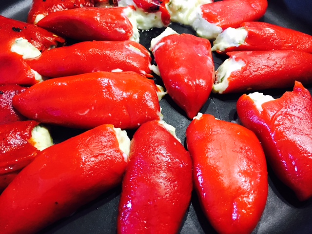 Una vez templado o frío el relleno y con ayuda de una cucharadita vamos rellenando los pimientos y colocándolos en una cazuela baja.