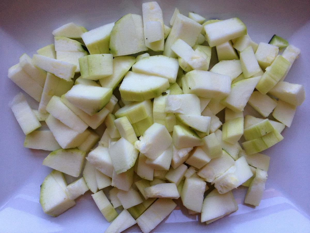 1 Pelamos los calabacines con un pelador y los troceamos en Brunoise, no es necesario que sean trozos muy pequeños, mas bien un tamaño normal.