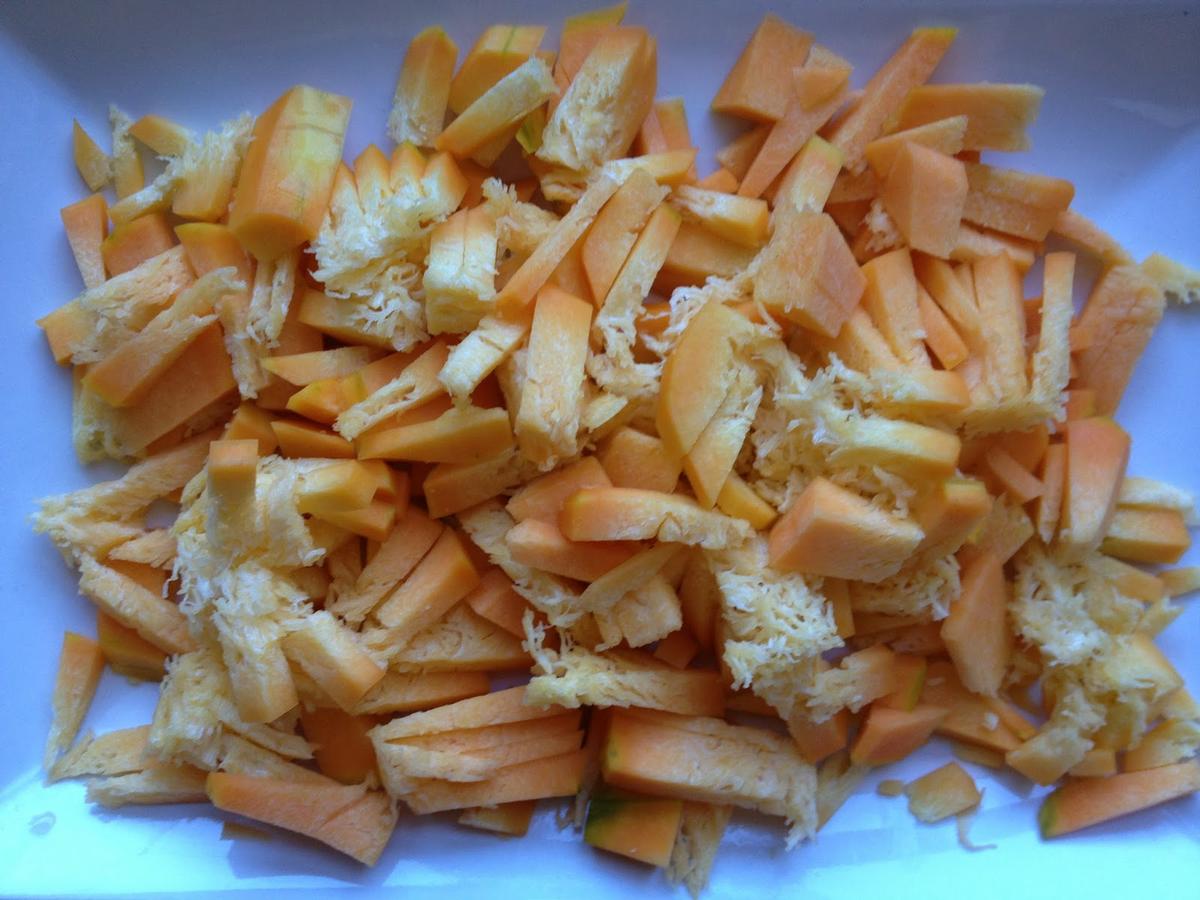 2 A continuación pelamos la calabaza,retirando la peladura y la troceamos de la misma manera.