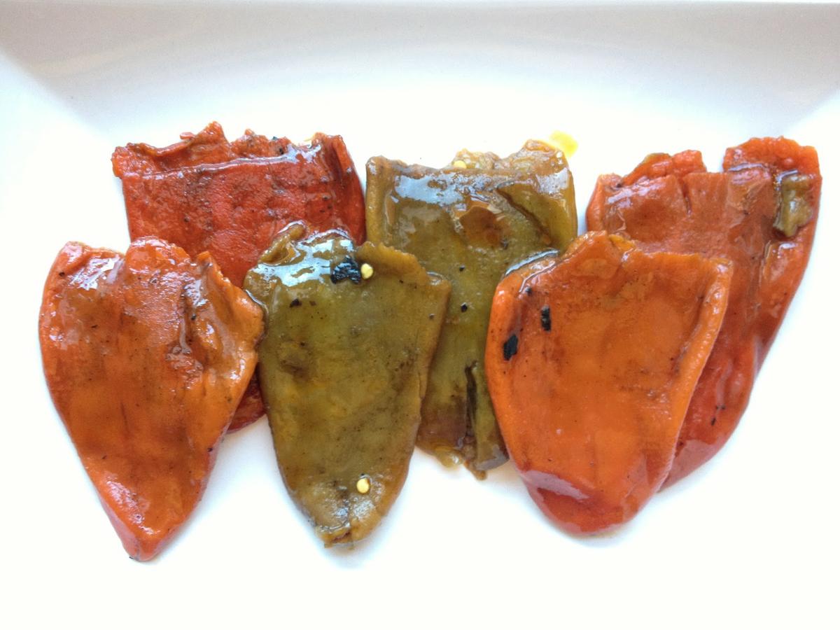 5 Mientras,sacamos los pimientos enteros del tarro,ponemos otra sartén a calentar con una gota de aceite, una vez caliente el aceite y a fuego intenso, agregamos los pimientos con cuidado sin romper y echamos sal y azúcar, vuelta y vuelta y los sacamos a un plato,solo queremos marcarlos, hay que tener en cuenta que los pimientos ya vienen asados.