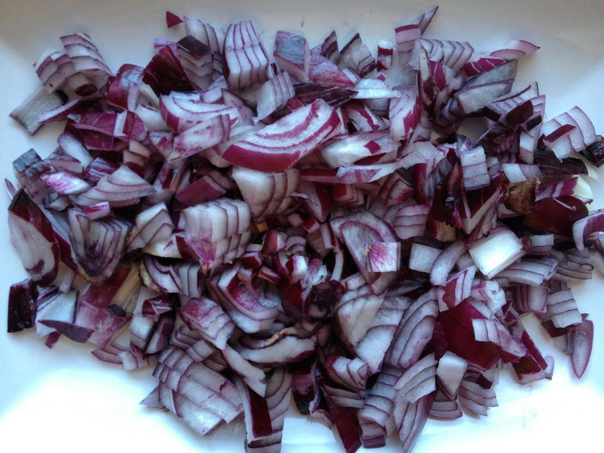 3 Ponemos a calentar una sartén grande con un pelín de aceite,mientras se calienta el aceite, cortamos en Brunoise 1 cebolla .