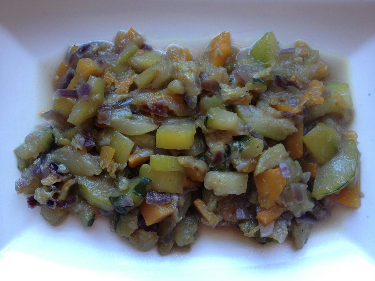8 Ya es momento de sacar la mezcla del calabacin y calabaza a un plato,vemos que su textura es blandita como cuando pochamos la cebolla.