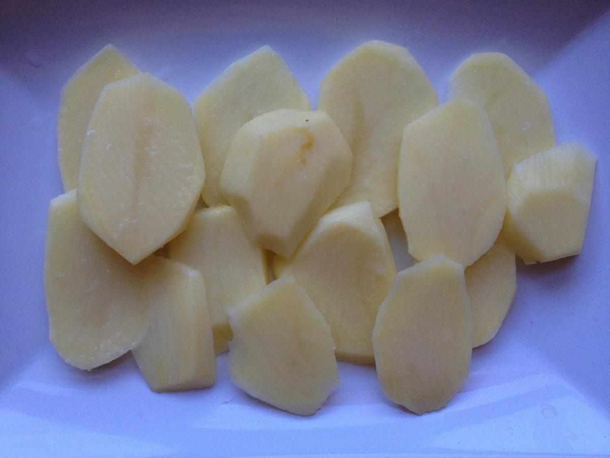 10 En un plato colocamos la patata previamente pelada y cortada en laminas,le incorporamos la sal y aceite de oliva y lo tapamos con papel film.