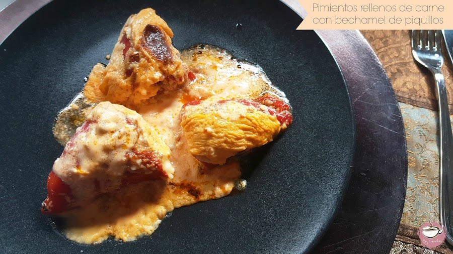 Con la carne ya fría vamos rellenando los pimientos. Reservamos 2 pimientos sin rellenar para la bechamel. Los disponemos sobre una fuente apta para el horno.
