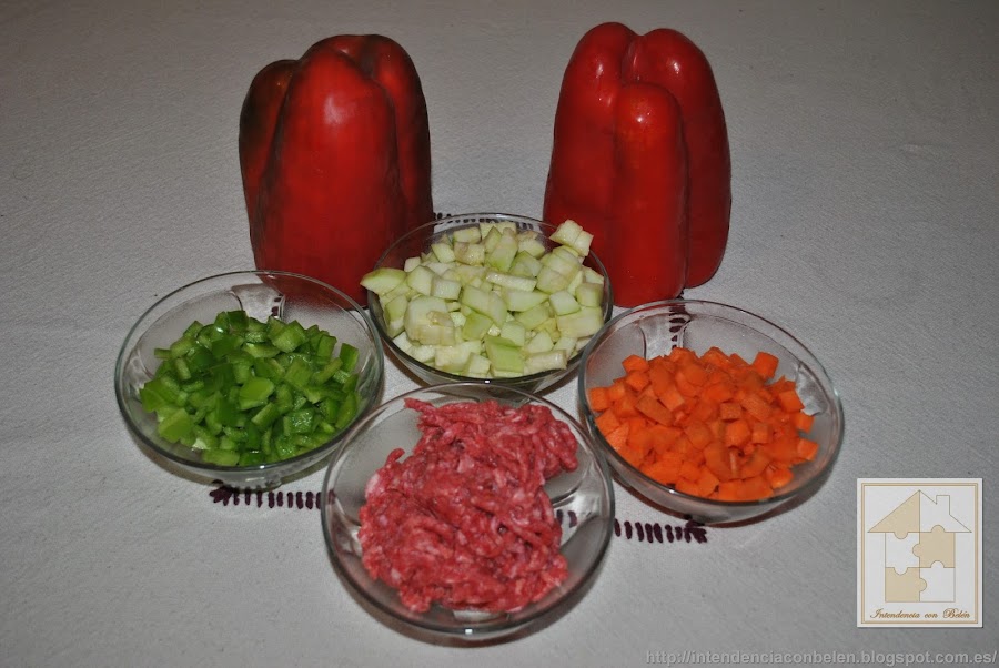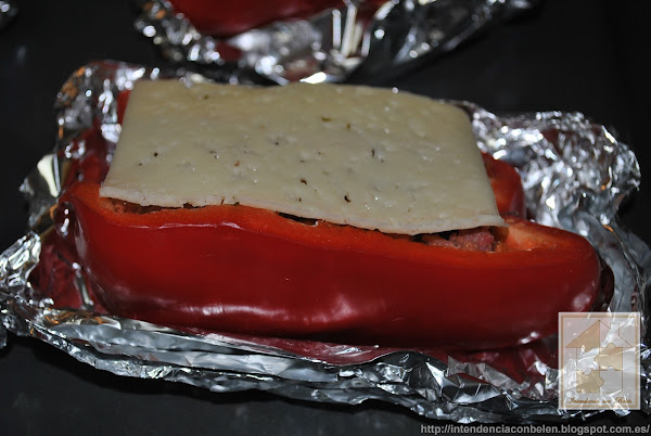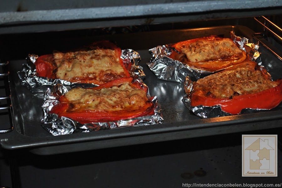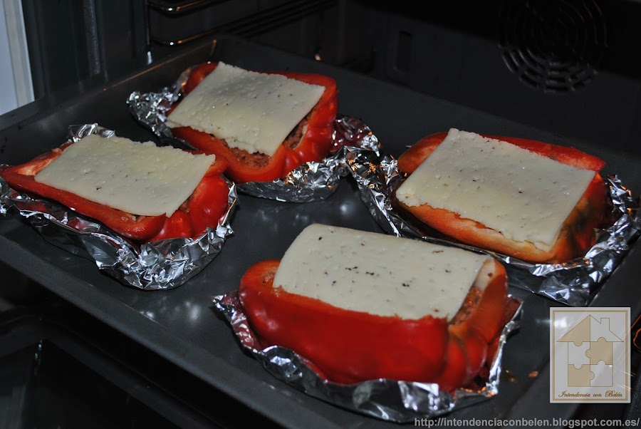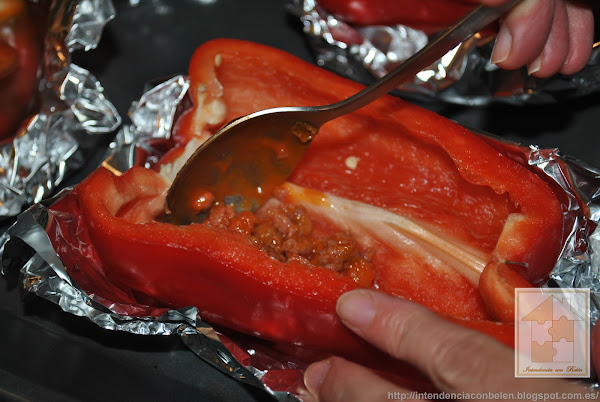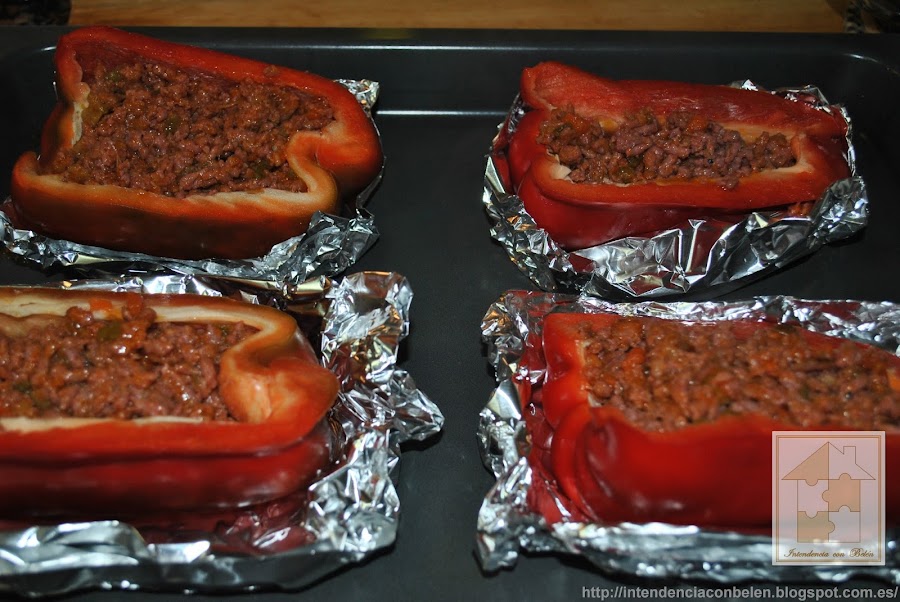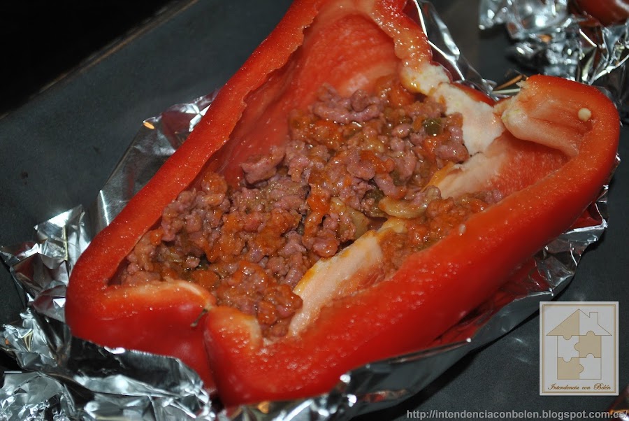 Yo suelo hacer un nicho en el que depositarlos con papel de aluminio, de ésta forma aprovecho el jugo que sueltan los pimientos al asarse, y además no se me mueven. Y los rellenamos con la carne y las verduras.