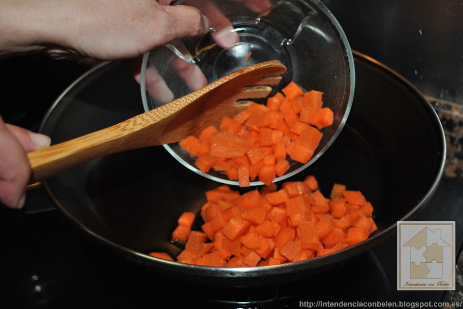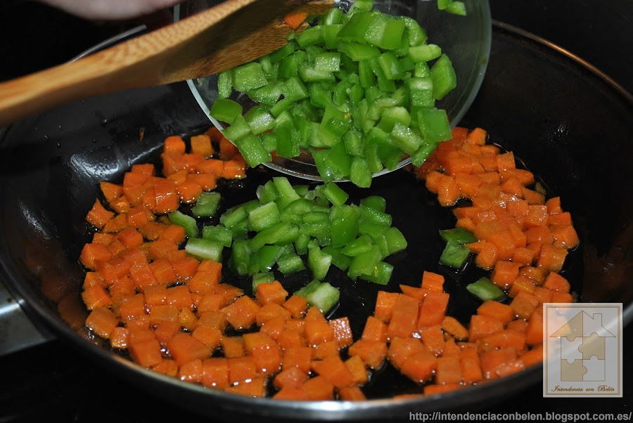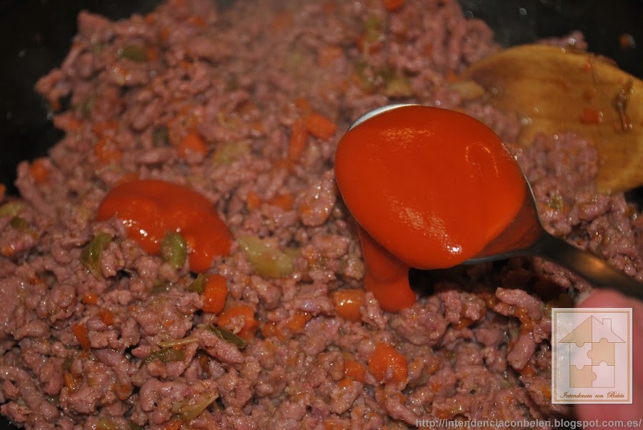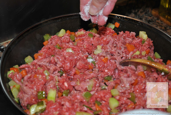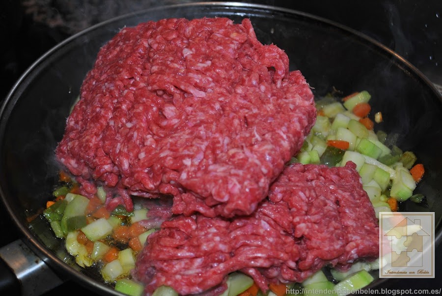 Cuando esté bien tierna añadimos la carne picada. Yo suelo usar mitad cerdo y mitad ternera.