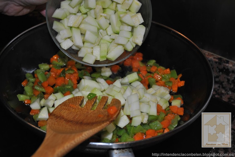 En una sartén, añadimos un chorrito de aceite y vamos añadiendo la verdura hasta que quede bien tierna.