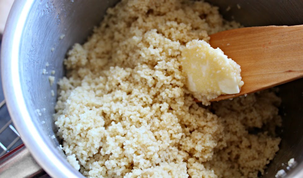 Lo ponemos en una cazuela a hervir y en cuanto llegue a ebullición, añadimos el cous cous, tapamos y retiramos del fuego.