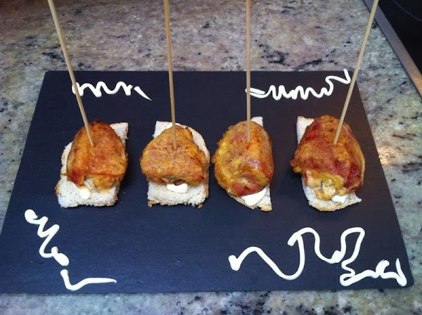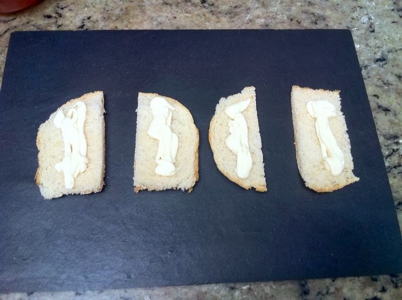 Por último, cortaremos unas rebanadas de pan bimbo por medio, y en cada rebanada, echaremos un chorrito de mayonesa.