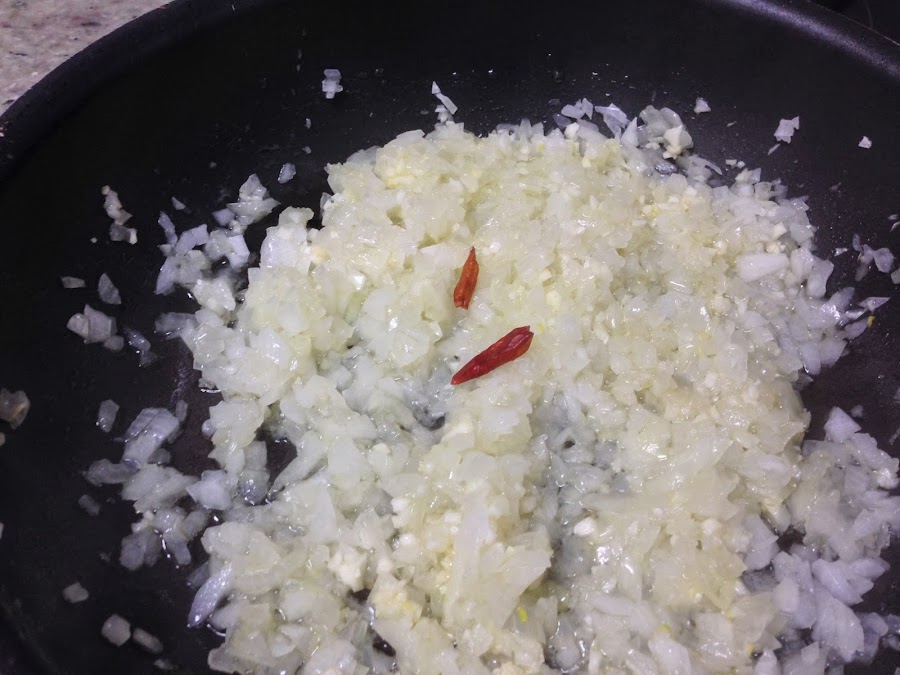 Una vez añadido a la sartén, echaremos las dos cayenas enteras y un puñadito de sal.