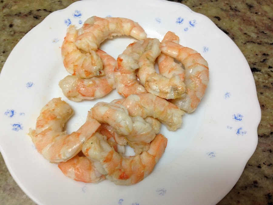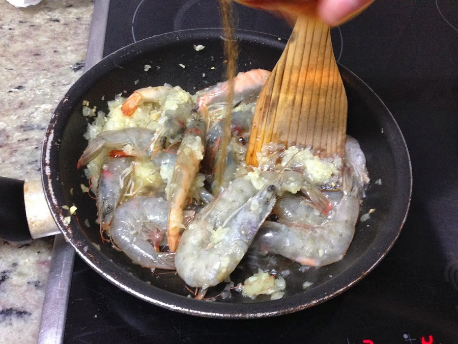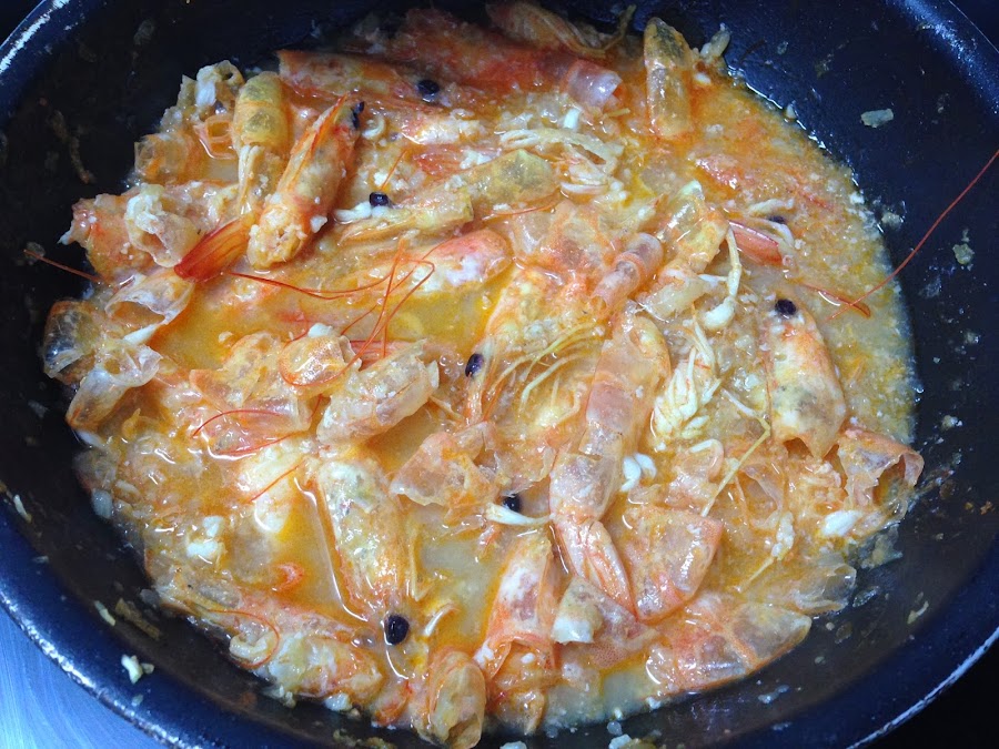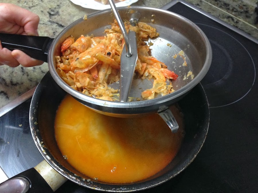 Hacemos bien los langostinos durante unos 4 minutos, y los sacamos para pelar, sin tirar las cascaras, ya que las volveremos a poner en la sartén.