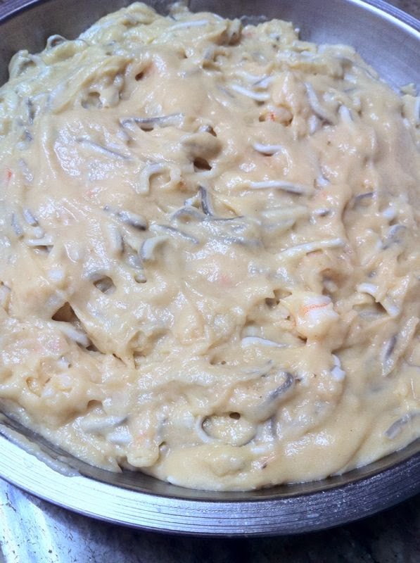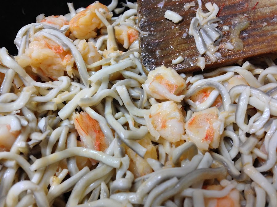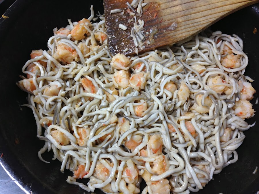 Cuando la tengamos espesa, y tras haberla añadido la sal, apagaremos el fuego, y echaremos la mezcla de angulas sucedáneas y langostinos.