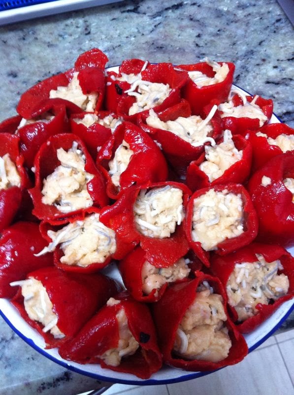 Pimientos rellenos de angulas sucedáneas y langostinos.
