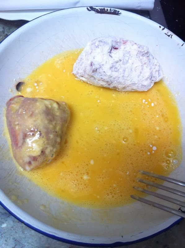 Pondremos en un plato un poco de harina, y en otro un huevo batido.