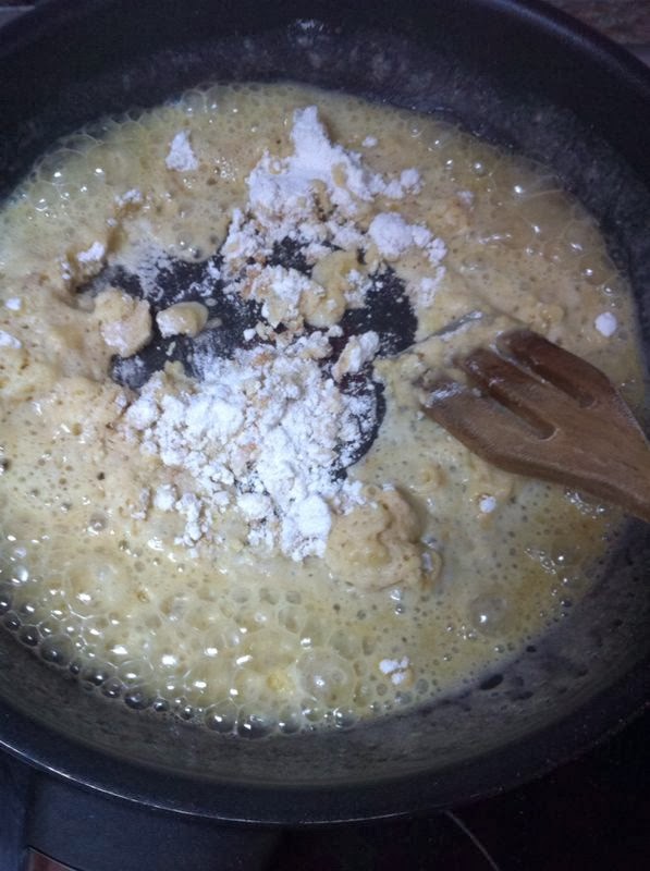 Tres cucharadas de harina cuando el fuego este caliente, y removemos bien, para cocinarla.