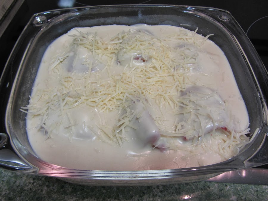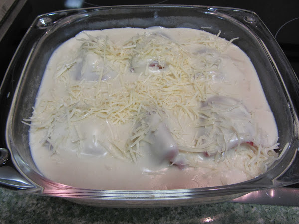 Cubrimos los pimientos con la bechamel, y espolvoreamos con el queso rallado.