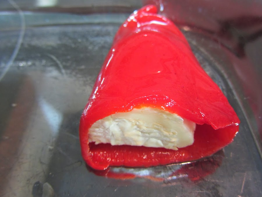 ... y rellenamos los pimientos, partiendo trozos del tamaño aproximado de un quesito en porciones, o algo más chicos.