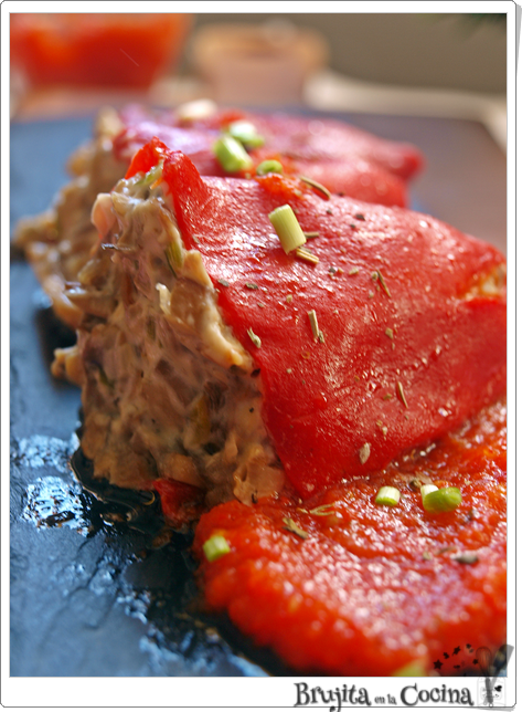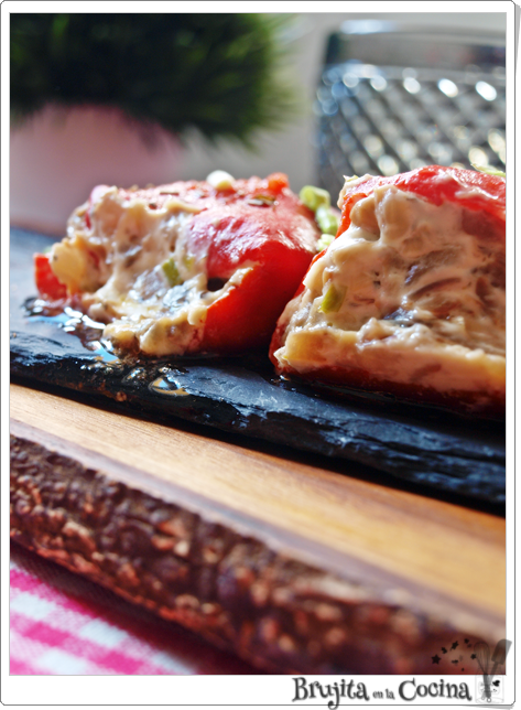 Cubrimos una fuente o plato hondo con la parte de la salsa, colocamos los pimientos rellenos encima pincelamos con aceite y horneamos a 180ºc durante 10 minutos o cuando veamos que estén listos.