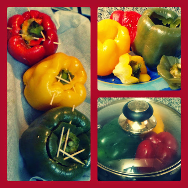 Ponemos una olla con agua a hervir e introducimos los pimientos durante apróx. 10 minutos para que se ablanden ( blanquear). Una vez estén blanditos cortamos el tallo de forma circular, cortando también un poco de carne del pimiento alrededor del tallo.
