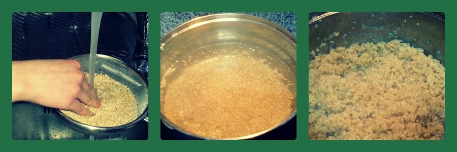 Echar la quinoa en un colador y ponerla debajo del grifo y hacer movimientos con las manos y escurrirla. Siempre hay que limpiar la quinoa antes de cocinarla porque contiene saponinas, una sustancia tóxica que da un sabor jabonoso y que puede producir irritaciones digestivas. Nosotras hemos seguido las instrucciones que vienen indicadas en el paquete, pero podéis hacer varias lavadas por precaución.