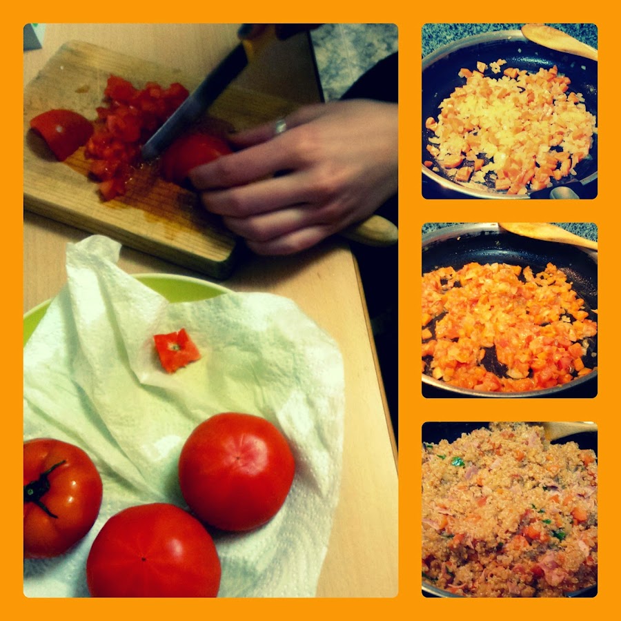 Mientras se cocía la quinoa comenzamos con el sofrito. Primero pochamos la cebolla a fuego lento y cuando esté un poco dorada añadimos la zanahoria y más tarde el tomate, dejamos que se cocine lentamente y añadimos una cucharada de tomate frito. Por último añadimos el pavo, el perejil y una cayena troceada ( pequeñita, lo que pica al entrar pica al salir). Añadimos la quinoa ya cocida y removemos con el sofrito hasta que quede bien integrado. Por último echamos sal al gusto y una cucharadita de Ras al Hanout.