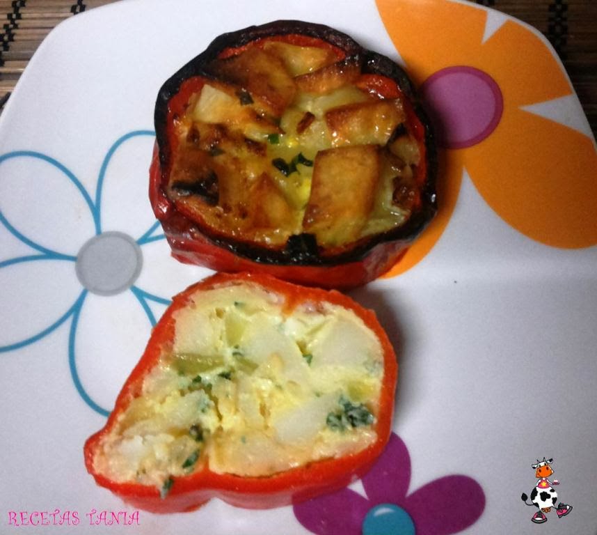 Cortamos la parte de arriba de los pimientos, vaciamos las semillas,los lavamos y reservamos. Pelamos,lavamos, cortamos las papas en cuadritos y las freímos En un bol batimos los huevos y le ponemos un poquito de sal y perejil picado,una vez esté frita las papas las añadimos al bol donde están los huevos y sofreímos la cebolla.Cuando la cebolla esté pochadita la añadimos al bol con las papas,los huevos y el perejil,mezclamos todo bien. Rellenamos los pimientos con la mezcla,los ponemos en un bol pequeño apto para horno