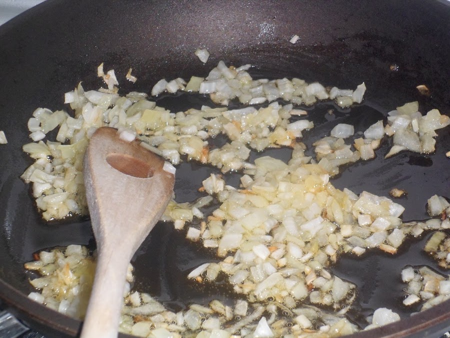 En una sartén con 3-4 cucharadas de aceite rehogaremos la cebolla y el ajo, a fuego medio.