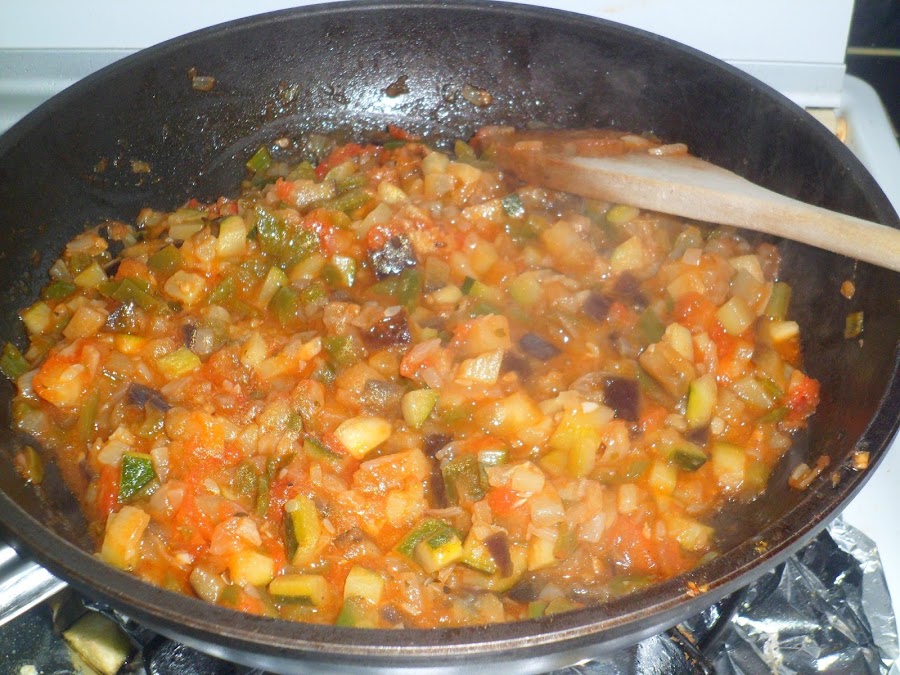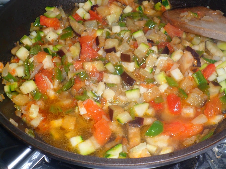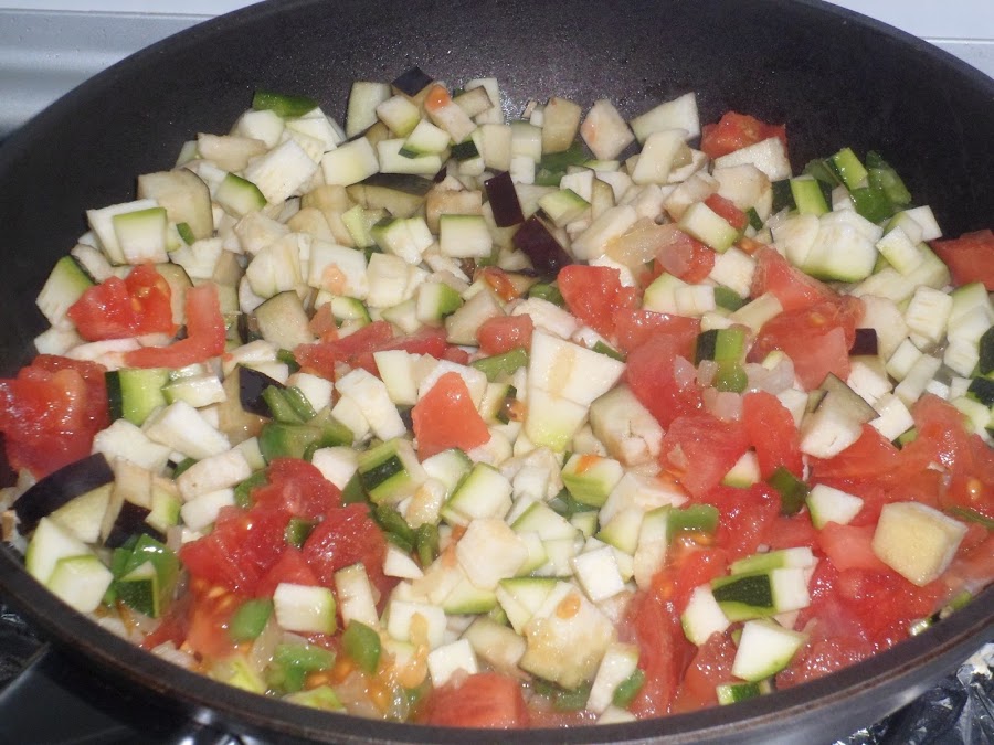Y ya echaremos el resto de las verduras picadas, lo dejaremos unos 5 minutos para que se rehogue bien y echaremos el tomate frito a gusto de cada uno.